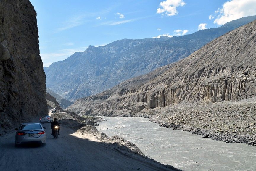 návrat na jih po KKH, památník na soutoku řek Gilgit a Indus (rozhraní tří nejvyšších pohoří světa, Himálaje, Hindúkuše a Karákóramu), zastávka u známého Raikotbridge, skalní reliéfy u města Chilas