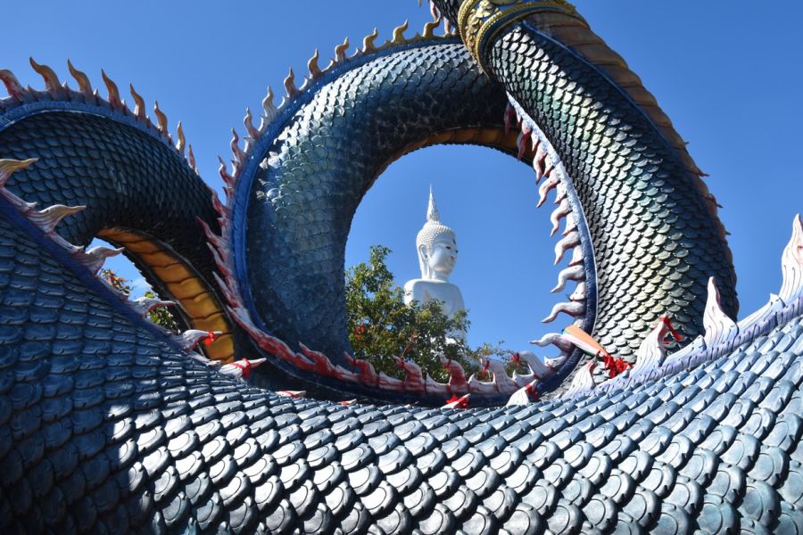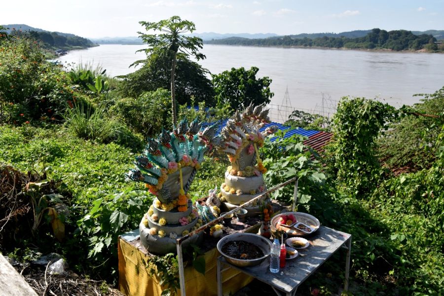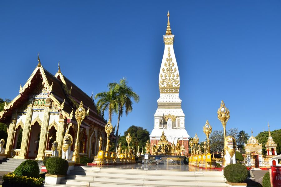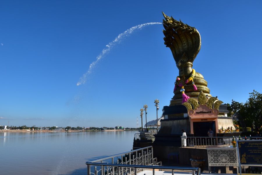 Nakhom Phanom - Wat Phra Yai s nejvyšší sochou Buddhy v Isanu (25 m), nábřežní promenáda při Mekongu s výhledem na malebnou kopcovitou krajinu Laosu a obří hadí božstvo Nága chrlící vodu, dojezd That Phanom - proslulé buddh. poutní místo, Wat Phra That Phanom možná vznikl již v 6. stol., hlavní čedí v laoském stylu, jako cennou relikvii uchovává Buddhovu klíční kost