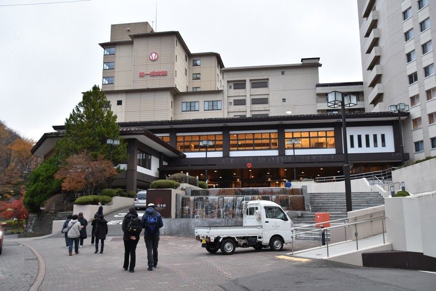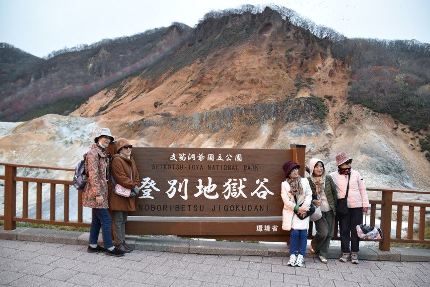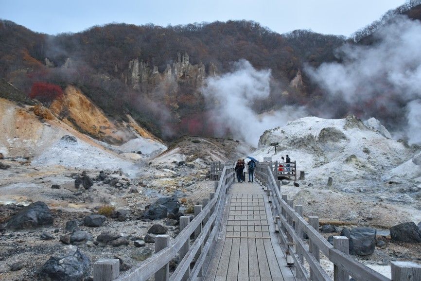 půjčení minivanu na nedalekém letišti Chitose a prohlídka nového Národního Musea Ainů (původní domorodci Hokkaida) na místě jejich vesnice Upopoy a návštěva nejvýznamnějších termálních lázní na Hokkaidu - Noboribetsu v NP Šikocu-Tója, projdeme si barevné Pekelné údolí s mnoha geotermálními jevy, po povalovém chodníku k vřícímu vývěru Tessen-IKE (130°C), gejzír