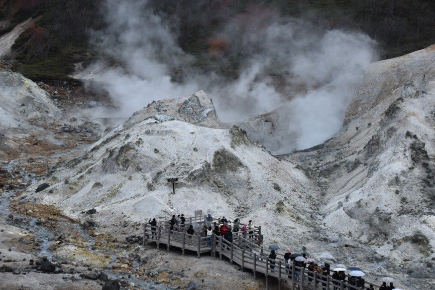 projedeme národním parkem Shikotsu-Toya, kromě samotného jezera Toyako se v této oblasti nacházejí horké prameny a aktivní sopka Mount Usu, která naposledy vybuchla v roce 2000, hora Usu nese odpovědnost za vznik nové hory Showa Shinzan, jež je jednou z nejmladších hor v Japonsku, po silném zemětřesení se hora náhle zvedla z plochého pšeničného pole do své současné výšky 290 m mezi lety 1943 a 1945 a byla pojmenována podle tehdejší vlády císaře Šówy (1926–1989), je stále aktívní a vypouští sírné výpary, v přístavu Otaru možnost ochutnávky místního saké